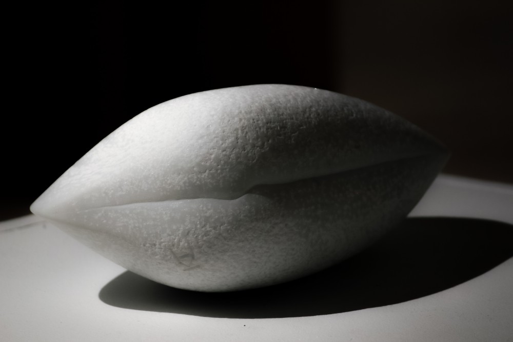 En mussla i marmor med krysshamrad och räffelhamrad yta med finslipade kanter och detaljer. Foto: Alex K Tyrefors