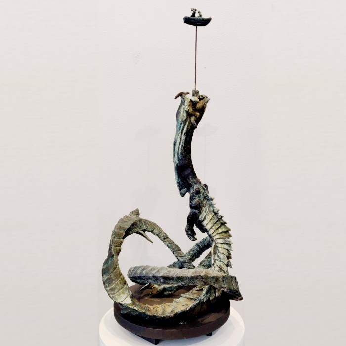 Tor agnar reven med ett tjurhuvud och efter lång tålmodig väntan nappar det äntligen och Tor drar Midgårdsormen närmare båten.