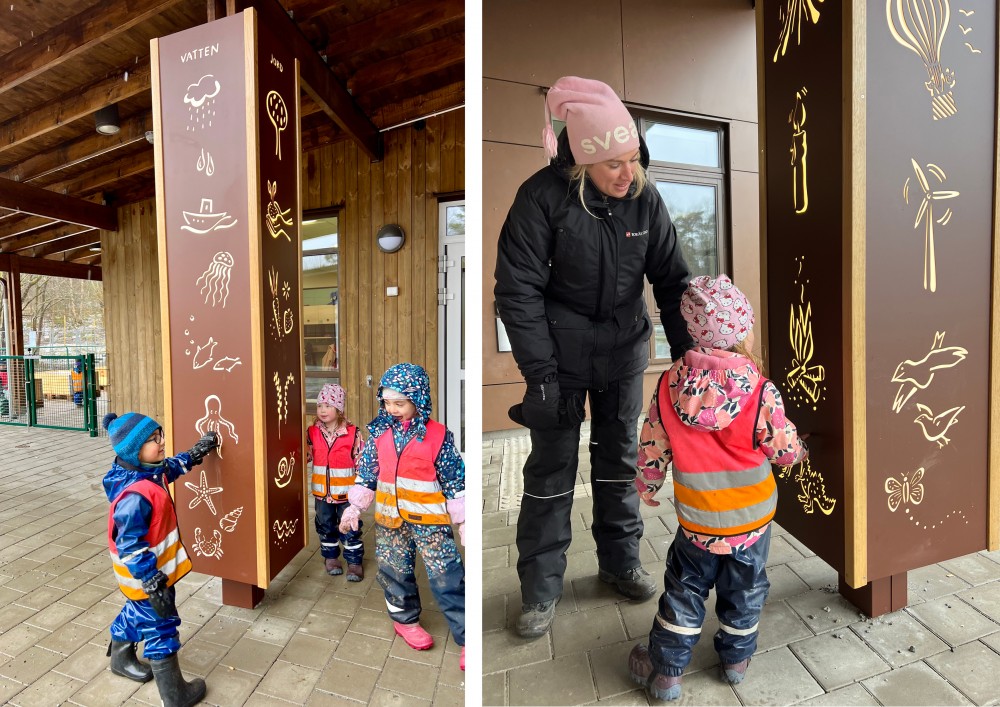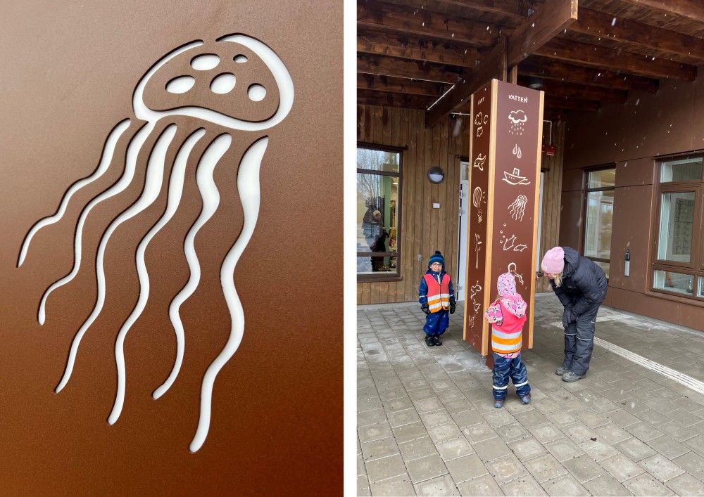 Verket är en pelarskulptur med urfrästa bilder i plåt av de olika elementen. Hålbilderna lyses upp av bakomliggande belysning samt skapar en taktil relief där betraktaren kan känna på bildernas utskärning.