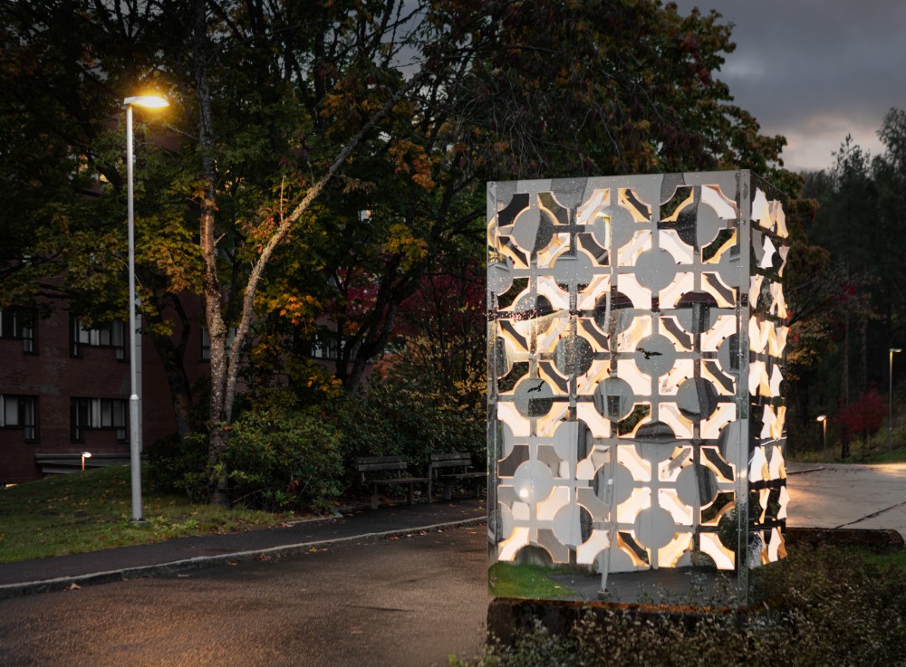 Fasettmönstret, som bygger på pelarnas form, speglar omgivningen och kastar ljusreflekter. På kvällen tänds den upp som en lykta. (Foto: Mikael Stenberg)