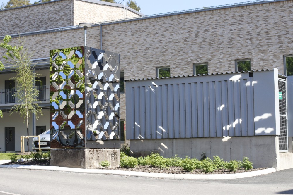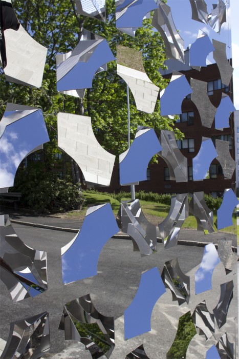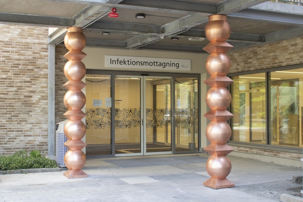 Den spegelpolerade skulpturens mönster möter en när man kommer upp för backen till Infektionsmottagningen.