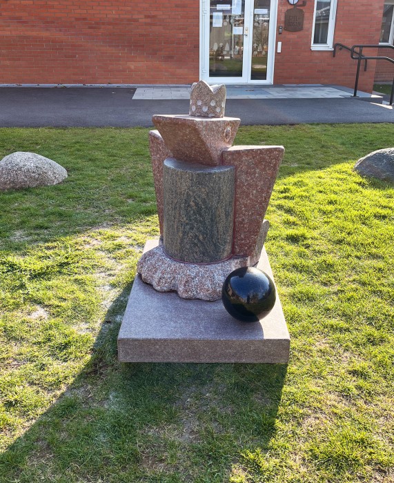 En stenskulptur i granit uppbyggd av geometriska former utifrån förskolans pedagogiska önskemål. Foto Kerstin Dahl Norén