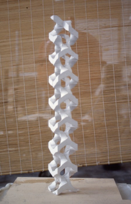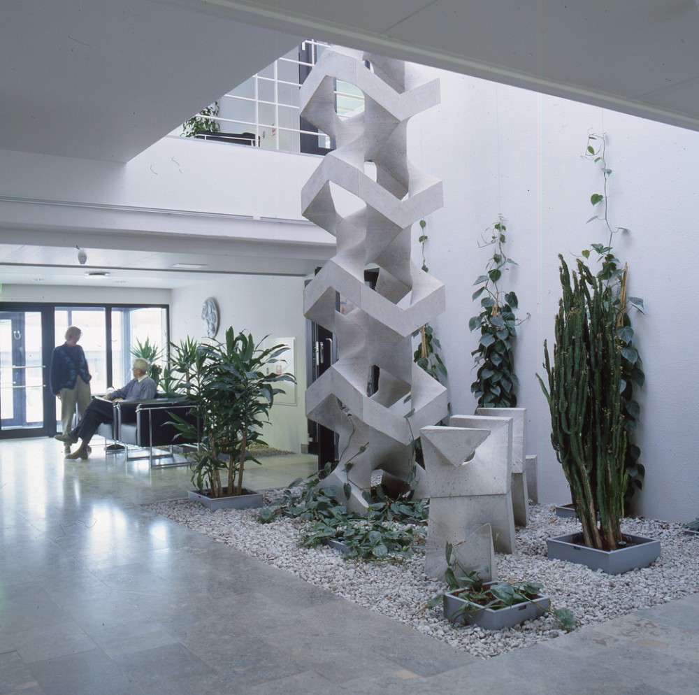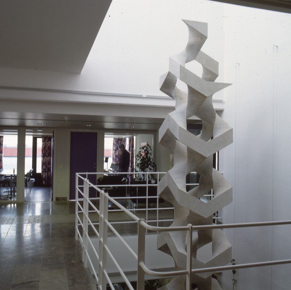 Skulpturen 'Fossilt avtryck', gjuten i ett stycke i betong, reser sig upp genom entréhallens öppna våningsplan.