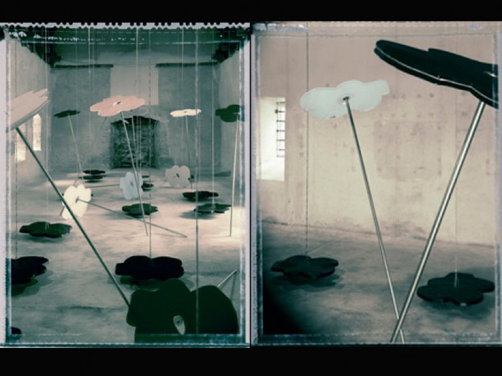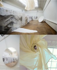 Friktion - utställning på Konstnärshuset, Stora Galleriet i Stockholm 2009. Teknik: Mobiler, textil, video, teckning, gips & trä.