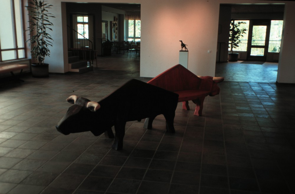 Två tjurar som bildar en "Fästmanssoffa" i entrén till Bengtsfors kulturhus, bibliotek och gymnasieskola. Träskulpturer med funktion, anslagstavlor i trä och screeenad väv, till biblioteket och träreliefer i cafedelen. "Kunskapens träd"