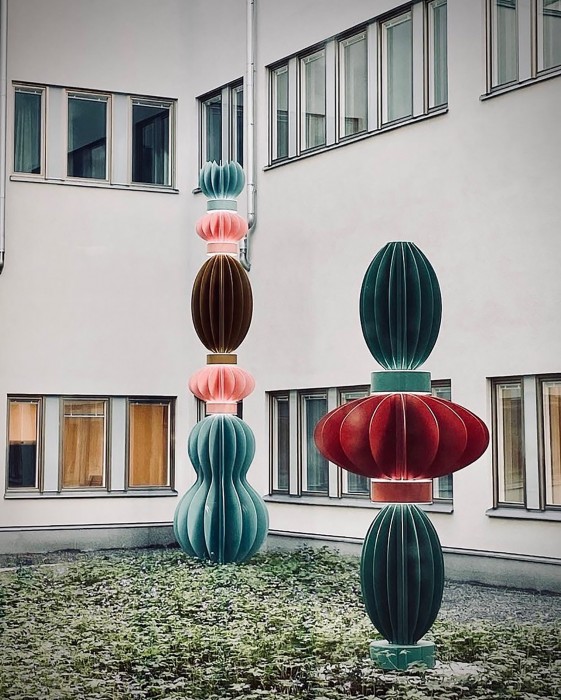 Mjuka, färgrika sfärer med inbyggt led-ljus. Gårdarna är stängda och ska inte beträdas, pga Byggnadens skyddsklassning.