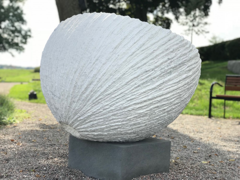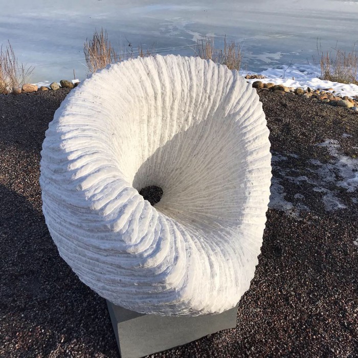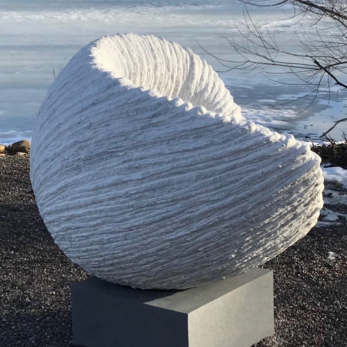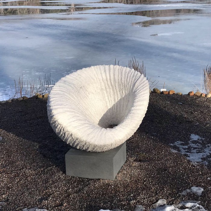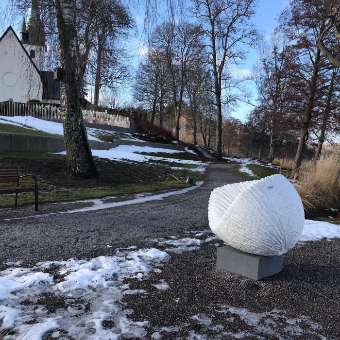 Skulpturen står vid vattnet i den landskapsarkitekt tecknade ?Läkande Vandring?, Frustuna Kyrka, Gnesta, Sörmland